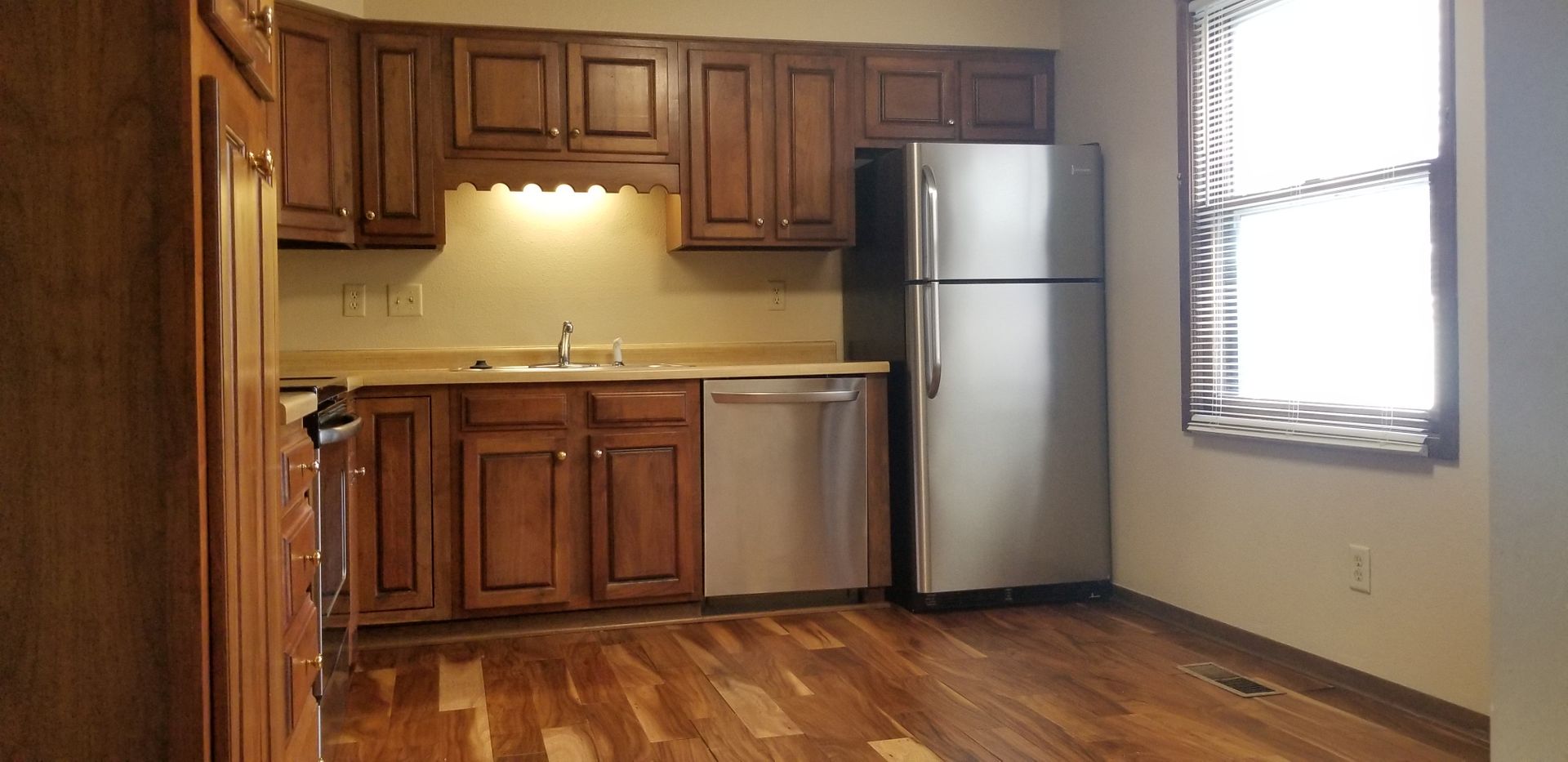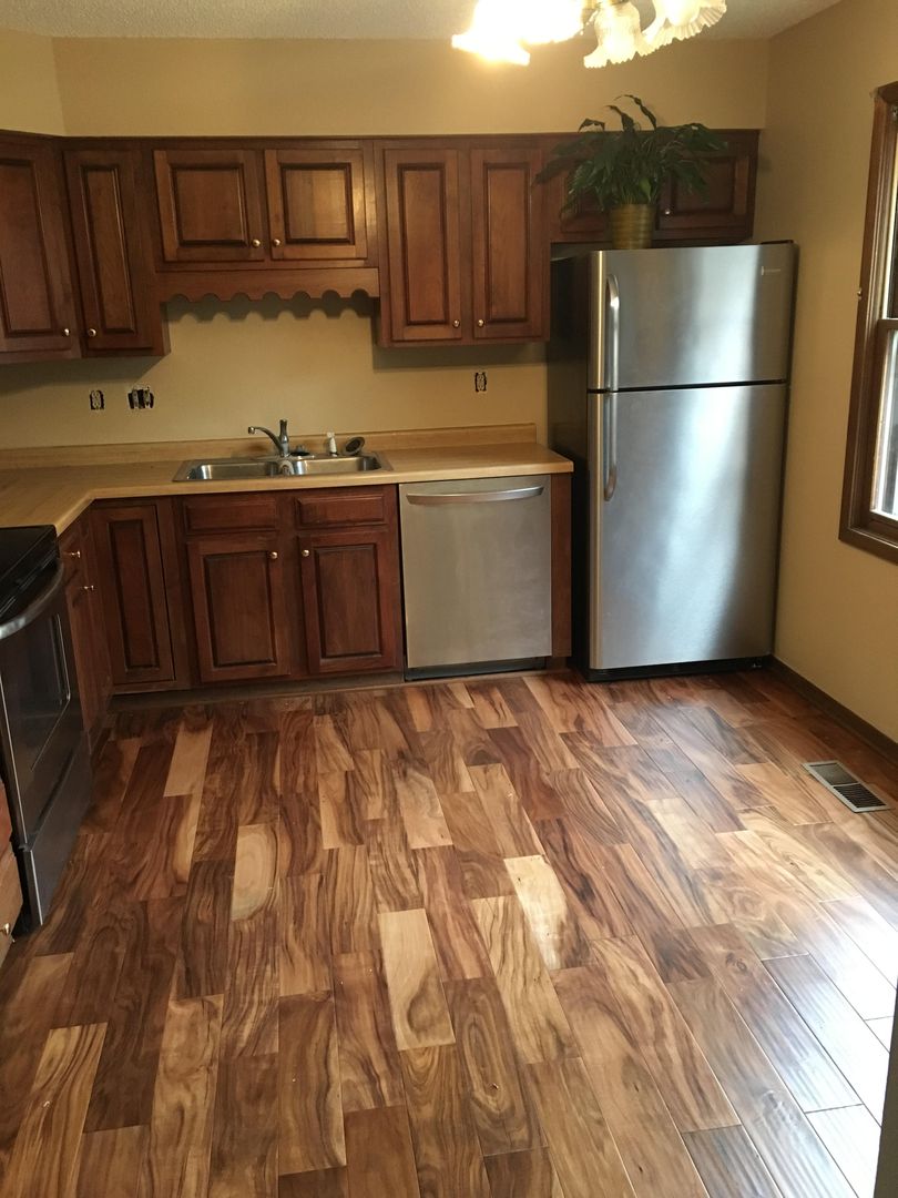 Open-concept kitchen with updated appliances (fridge, stove & dishwasher)
